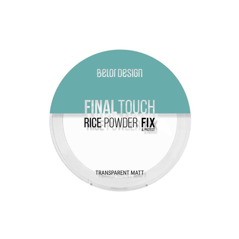 Belor Design Final Touch Rice Fixing Powder — Рисовая пудра-фиксатор для лица, 8,7 г — лёгкая фиксирующая пудра на основе рисовых компонентов, которая помогает закрепить макияж, выровнять тон кожи и придать лицу мягкий матовый финиш. Невесомая текстура тонким слоем ложится на кожу, уменьшает заметность жирного блеска и делает макияж более аккуратным и стойким в течение дня. Пудра создаёт эффект более гладкой и ухоженной кожи без утяжеления.